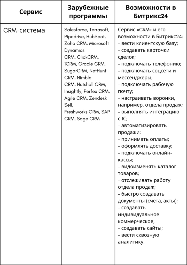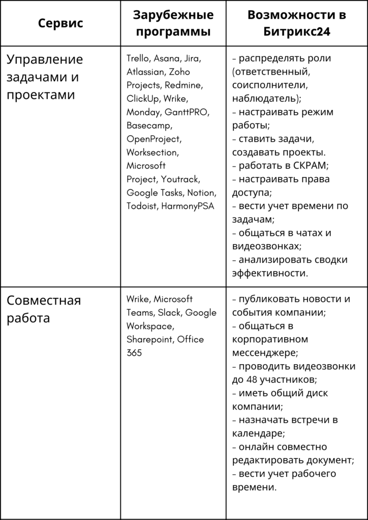 Мы подготовили сравнительную таблицу с инструментами Битрикс24 и то, какие сервисы они заменят:
