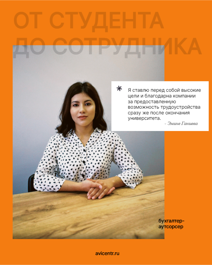 В компании «АВИ-Центр» с помощью более опытных сотрудников я каждый день приобретаю практические навыки в своей профессии. Сегодня я самостоятельно занимаюсь ведением налогового и бухгалтерского учета, расчетом зарплаты, формированием и сбором первичных документов, сдачей отчетности нескольких предприятий; ставлю перед собой высокие цели и благодарна компании за предоставленную возможность трудоустройства сразу же после окончания университета.