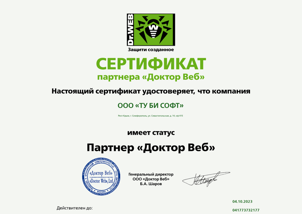 Решения Dr.Web находятся Реестре отечественного ПО, имеют сертификаты соответствия ФСТЭК России, ФСБ России и Минобороны России. Продажи продуктов Dr.Web реализуются через партнёрскую сеть.