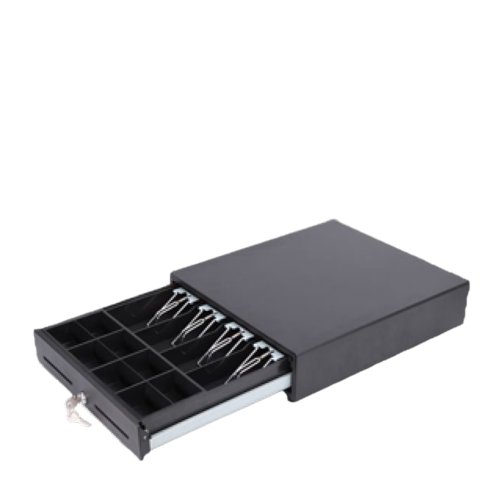 Компактный денежный ящик с отделением для монет, купюр и документов. Ширину отделений для купюр можно настраивать, лоток двигается по прочным металлическим направляющим.